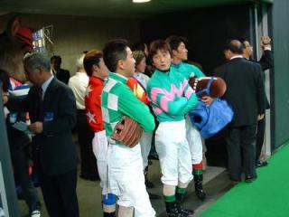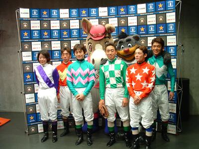 日本ハムファイターズ札幌ドーム始球式にジョッキーが登場 2004.09.17 9月17日(金) 札幌ドームで行われた日本ハムファイターズ戦の始球式に ホッカイドウ競馬のジョッキーとホクト君が登場しました。 コスモバルク号のセントライト記念出走が直前であることが 場内アナウンスで紹介されると、場内からは「五十嵐!頼むぞ!!」の 声と拍手が 投者となった宮崎光行騎手がセットポジションになるときには 「み!や!ざ!き!」と大きなかけ声があがりました。 投球後、騎手達はファイターズのヒルマン監督にマスコット人形と ジョッキーが競走で使う「ムチ」がプレゼントされました。