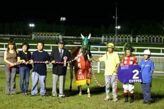 第6回 華月賞 ビッグマウス号が制覇! 2006.07.13 旭川ナイトレース重賞第2弾の第6回華月賞(3歳オープン 1,500m 12頭立て)が行われ、千葉津代士騎手鞍上の6番人気ビッグマウス号が1分37秒4のタイムで見事優勝を飾りました。 レースは、まずまずのスタートから終始インコースの2~3番手を進んでビッグマウス号がカネマサパッション号との追い比べを制し、4分の3馬身差をつけてゴール。 千葉津代士騎手のコメント 「最後の直線で頑張ってくれと思いながら馬を信じて追いました。」