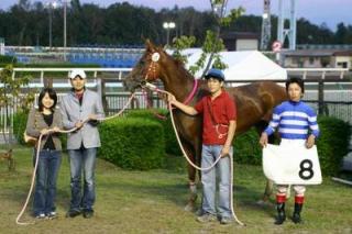 第3回 優勝馬との写真撮影体験 2006.09.14 9月14日、3回目の「優勝馬との写真撮影体験」が旭川競馬場で行われ、抽選で選ばれた一般ファン2名が写真撮影体験を行いました。 写真撮影体験に参加したのは、旭川市内の金子尚広さんと美和さんご夫妻。 二人は、ウィナーズサークルで第7レースの優勝馬ナルニアルーシー号、中村騎手らと一緒に口取り写真撮影に参加しました。 撮影終了後には、中村騎手からサインをもらい喜んでいました。