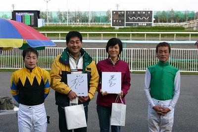 8回目をむかえた「旭川ジョッキーシート」は、両騎手がラッキーシートの当選者1人1人にサイン色紙や競馬グッズをプレゼントし、また、一緒に写真撮影も行い、ファンは大喜びでした。