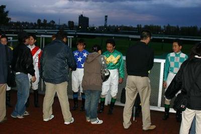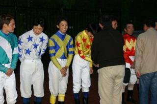 ホッカイドウ競馬ジョッキー握手会! 2006.11.09 11月9日、札幌競馬場で最終レース終了後にジョッキー握手会が行われ、かけつけたファン約200名がジョッキーと握手を交わしました。 握手会は、北海道調騎会騎手部会と北海道厩務員会の主催で、今シーズンの声援に対しての感謝の気持ちを込めて開催しました。 初めに騎手の佐々木国明騎手会長から、ファンに対してお礼の挨拶がされ、引き続き、騎手のサインやブルゾン、ポロシャツなどが当たる抽選会が行われ、その後、参加騎手全員と握手を交わしました。