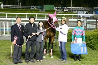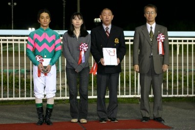 第2回 スタリオン競走表彰プレゼンター 2007.05.24 5月24日、旭川競馬場で「第2回 スタリオン競走表彰プレゼンター」が行われました。 第2回目は「タイムパラドックス賞」で旭川市内の村形恵美子さんがプレゼンターを務め、優勝馬サクラハーンの林和弘調教師(馬主代理)、川島洋人騎手に記念品を贈呈しました。 写真 上:関係者と口取り写真 下:表彰会場で記念写真