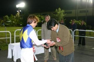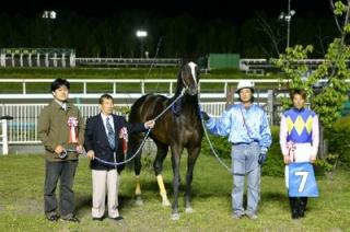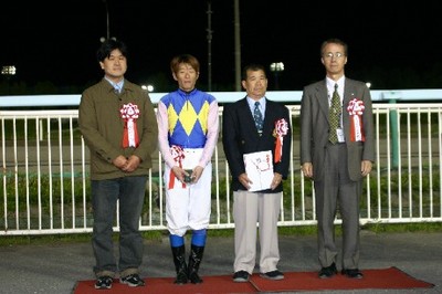 第3回 スタリオン競走表彰プレゼンター 2007.05.29 5月29日、旭川競馬場で「第3回 スタリオン競走表彰プレゼンター」が行われました。 第3回目は「ミラクルアドマイヤ賞」で香川県の井上良教さんがプレゼンターを務め、優勝馬バザラタイショウの北川調教師(馬主代理)、服部茂史騎手に記念品を贈呈しました。 なお、プレゼンターには、㈱サラブレッド・ブリーダーズ・クラブから提供された、種牡馬パンフレットが贈られました。 写真 上:口取り写真 中:優勝の服部騎手へトロフィー贈呈 下:関係者と記念撮影