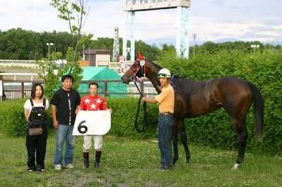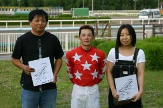 第10回 優勝馬との写真撮影体験! 2007.07.05 7月5日、旭川競馬場で、第10回「優勝馬との写真撮影体験」が行われ、旭川市の一般ファン2名が写真撮影を行いました。 2名は、第7レースの優勝馬モエレフェミニン、五十嵐冬樹騎手らと口取り写真に参加し、撮影後にはサインをもらい記念撮影をしました。 写真 上:口取り写真 下:五十嵐騎手からサインをもらい記念撮影