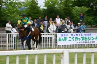 7月12日、ホッカイドウ競馬を応援するために、昨年、町長や有志議員で発足させた組合馬主「新冠軽種馬議連組合」(代表・堤俊昭議員)が所有している競走馬「ニイカップビジン」(山口竜一騎手)が、旭川競馬第6レース フレッシュチャレンジ競走でデビューし、4着となりました。