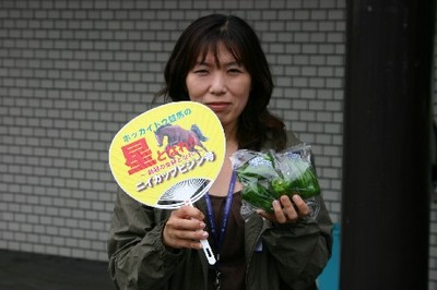 下:入場者にプレゼントした応援うちわと新冠ピーマン