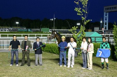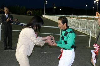 第19回 スタリオン競走表彰プレゼンター 2007.07.19 7月19日、旭川競馬場で「第19回 スタリオン競走表彰プレゼンター」が行われました。 第19回目は「マンハッタンカフェ賞」で、上川町のファンがプレゼンターを務め、優勝馬ビービーライナーの馬主と山口竜一騎手にそれぞれ記念品を贈呈しました。 また、プレゼンターには、社台スタリオンステーションから提供された「種牡馬パンフレット」が贈られました。 写真 上:口取り写真に参加 中:優勝騎手にトロフィーを贈呈 下:「種牡馬パンフレット」をもらい、山口騎手と記念撮影