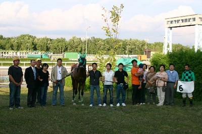 参加者は、第7レースの優勝馬ビービーダークライ、馬主(有)坂東牧場の関係者、林和弘調教師、山口竜一騎手らと口取り写真に参加しました。