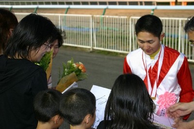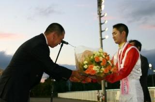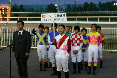 佐々木国明騎手 500勝達成表彰式 2007.07.26 7月26日、旭川競馬場で7月25日に500勝を達成した佐々木国明騎手(若松平厩舎)の表彰式が同競馬場スタンド正面で行われ、かけつけた多くのファンや関係者の祝福を受けました。 また、表彰式終了後には、佐々木騎手から集まったファンに花束やサイン色紙がプレゼントされました。 なお、表彰式では、藤倉騎手がプラカード持ちを務めてくれました。 写真 上:若松調教師(左)、佐々木騎手(右)、後ろは表彰式に参加した騎手 中:調騎会林副会長からの花束贈呈 下:かけつけたファンへ花束・サインのプレゼント