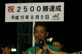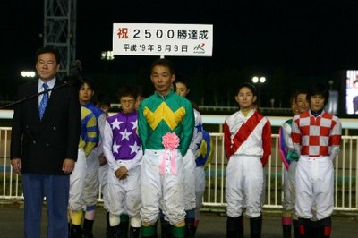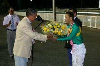 山口竜一騎手 2,500勝達成表彰式! 2007.08.14 8月14日、旭川競馬場で8月9日に2,500勝を達成した山口竜一騎手(桧森邦夫厩舎)の表彰式が同競馬場スタンド正面で行われ、かけつけた多くのファンや関係者の祝福を受けました。 また、表彰式終了後には、山口騎手から集まったファンに花束やサイン色紙がプレゼントされました。 なお、同厩舎の沼澤騎手がプラカード持ちを務めてくれました。 写真 上:(左)桧森調教師、(右)山口騎手 中:調騎会会長 堂山調教師から花束の贈呈 下:ファンへお礼を述べる山口騎手