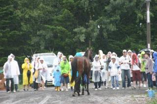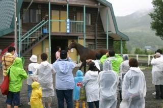 小雨の降る悪天候ながらも、参加者は通常立ち入ることの出来ない厩舎地区を見学しながら、自分のサポート馬に逢うと歓声をあげ、記念撮影を行いました。