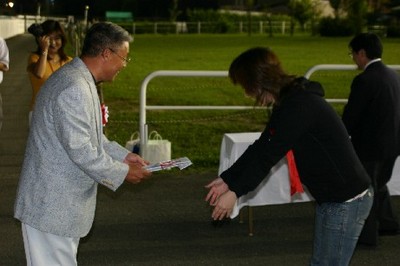 第29回目は「クロフネ賞」で、恵庭市のファンがプレゼンターを務め、優勝馬モエレフェミニンの堂山調教師(馬主代理)と宮崎騎手にそれぞれ記念品を贈呈しました。