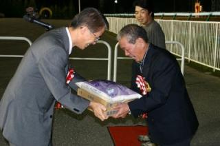 中:ふらの農協からの記念品を伊藤隆志調教師へ贈呈