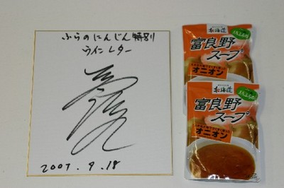 下:プレゼント商品(川島洋人騎手サイン色紙、オニオンスープ)