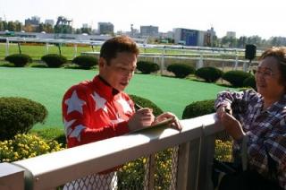 下:駆けつけたファンにサインをする五十嵐騎手