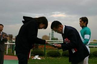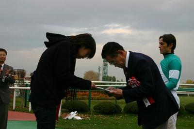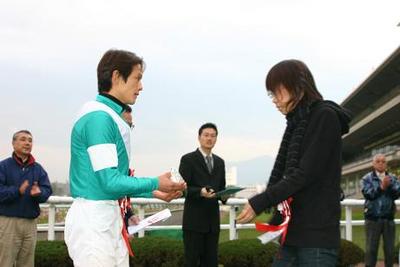 第48回目は「アドマイヤマックス賞」で、札幌市のファンがプレゼンターを務め、優勝馬マサノガーランドの黒川調教師(馬主代理)と川島雅人騎手にそれぞれ記念品を贈呈しました。
