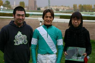 下:『種牡馬パンフレット』を手に川島雅人騎手と記念撮影