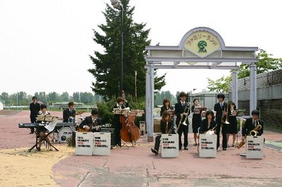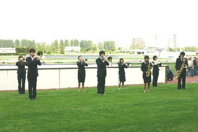 北海学園大学ジャズオーケストラが生ファンファーレ♪ 2008.05.22 ホッカイドウ競馬の重賞競走第8回エトワール賞で、北海学園大学「フリー・フォームレス・ジャズ・オーケストラ」が生ファンファーレを行い、札幌競馬の最終日を盛り上げました。 同オーケストラは、開門時にファンを迎える「お迎えコンサート」を実施、30分に及ぶ演奏に来場者は足を止め演奏に聴き入っていました。 また、メインレースのファンファーレでは、スタンド正面にて8名のメンバーが力強く演奏、エトワール賞に花を添えました。 写真 上:お迎えコンサート演奏 下:生ファンファーレ演奏