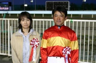 優勝馬ネフェルメモリーの馬主 木谷ツヤ氏と井上俊彦騎手にそれぞれ記念品を