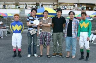 第3回ジョッキーシート プレゼンターは秋田大助騎手と山口竜一騎手! 2008.07.15 7月15日、3回目の「旭川競馬場ジョッキーシート」が行われ、ラッキーシートのプレゼンターは秋田大助騎手と山口竜一騎手が務めました。 第5レース終了時に当選シートが発表され、シート使用者にホッカイドウ競馬騎手部会よりお食事券がプレゼントされ、サインや握手にも応えファンの皆様も大喜びでした。