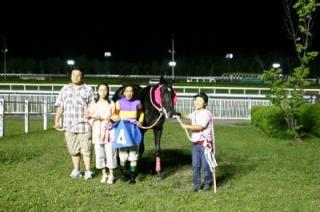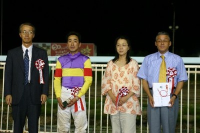 第20回 スタリオン競走表彰プレゼンター 2008.07.24 7月24日、旭川競馬場で第20回「スタリオン競走表彰プレゼンター」が行われました。 第20回目は「スズカマンボ賞」で、岩見沢市のファンがプレゼンターを務め、優勝馬カネマサディールの堂山芳則調教師(馬主代理)と宮崎光行騎手にそれぞれ記念品を贈呈しました。 また、プレゼンターには、(有)ホースバンクから提供された『スタリオンブック』等が贈られました。 写真 上:優勝馬カネマサディールと口取り写真 中:全員で記念撮影 下:宮崎光行騎手と記念写真
