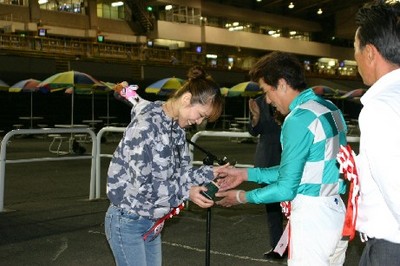 第25回目は「ボーンキング賞」で、旭川市のファンがプレゼンターを務め、優勝馬ディーズエトワール号の松本隆宏調教師(馬主代理)と宮崎光行騎手にそれぞれ記念品を贈呈しました。