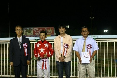 第30回 スタリオン競走表彰プレゼンター 2008.08.28 8月28日、旭川競馬場で第30回「スタリオン競走表彰プレゼンター」が行われました。 第30回目は「サウスヴィグラス賞」で大阪府のファンがプレゼンターを務め、優勝馬ラブストレングス号の村上調教師(馬主代理)と五十嵐冬樹騎手にそれぞれ記念品を贈呈しました。 また、プレゼンターには、(有)ホースバンクから提供された『スタリオンブック』等が贈られました。 写真 上:五十嵐冬樹騎手と記念写真 下:関係者と記念写真