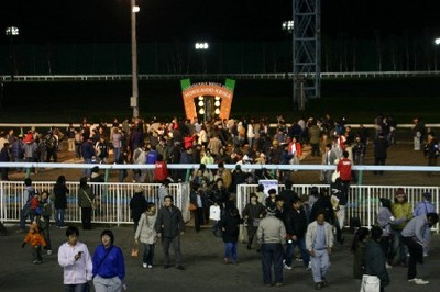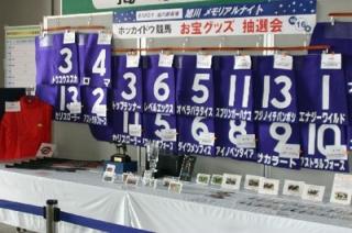来場者先着500名には入場時に旭川競馬場走路の砂のキーホルダー型小瓶がプレゼントされた他、ゼッケンなどが当たるお宝グッズ抽選会、石狩鍋、甘酒も無料で提供しました。最終レース終了後には走路開放が行われ、大勢のファンが馬場の感触などを体感しました。