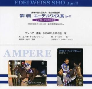 10月16日エーデルワイス賞(シンボリクリスエス賞)で優勝したアンペア号の馬主株式会社オリオンファーム様のご提供により「アンペア号優勝記念オリジナルクオカード」を抽選で2名様にプレゼントいたします。(山口竜一騎手サイン入り)