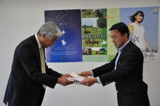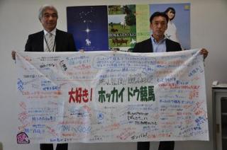 ホッカイドウ競馬存続メッセージ 寄せ書きフラッグ贈呈式 2009.09.02 9月2日(水)、門別競馬場で、昨日おこなわれた新ひだか町「2009Aiba祭・ホッカイドウ競馬存続メッセージ 寄せ書きコーナー」で作成された寄せ書きフラッグの贈呈式が行われました。Aiba静内応援事業実行委員会を代表して静内軽種馬生産振興会長西村和夫様からファンの方々の想いがつまった寄せ書きフラッグを贈呈いただきました。近日中に、門別競馬場スタンド内に展示する予定としております。