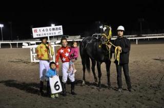 口取り写真では小林靖幸騎手がプラカードを持ってくれました。なお、1,400勝達成の表彰式は、明日(10月7日)6R終了後に行う予定です。