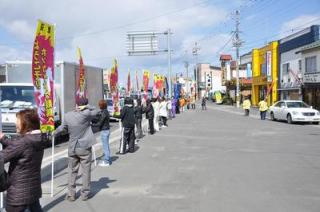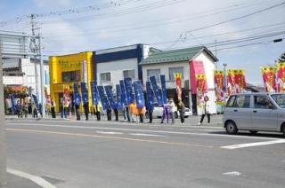 実施主体は、4月22日(木)札幌でのPR活動実施した日高町の商工会やトレセン町内会婦人部のメンバーで構成された「ホッカイドウ競馬を応援する会(半田会長)」を中心に約50名が集まり、色鮮やかなのぼりを並べて、明日のホッカイドウ競馬開幕をPRしました。