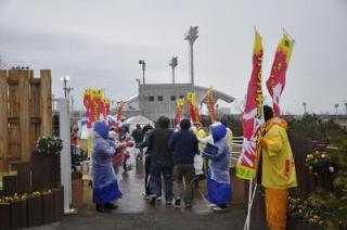本日開幕となった門別競馬場。先着来場者にプレゼントされたホクトくんタオルや日高特産市、ポニー広場などのイベントがとねっこ広場で行われ、風雨が強い悪天候のなか、884名(全道4,735)の方にお越し頂きました。