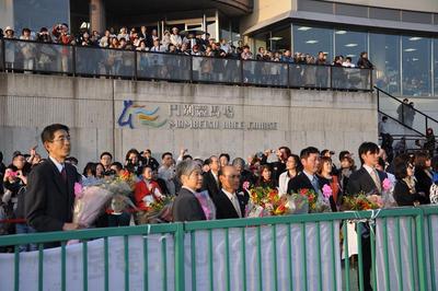 引退セレモニーでは、馬主である有限会社ビッグレッドファーム岡田美佐子様に功労馬表彰と北海道知事からの感謝状。関係者の皆様にファンの方々から花束が贈られました。