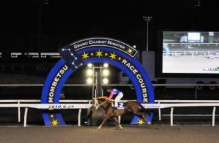 本日24日(木)、門別競馬場で行われた第9回フロイラインカップ (H3)[ステイゴールド賞]では、単勝1番人気クラキンコ号が船橋から参戦のプリマビスティー号に3馬身差をつけて優勝しました(1.11.5)。 同馬は、北斗盃・北海優駿(ダービー)に続き重賞3連勝。