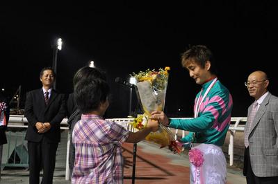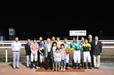 川島洋人騎手 900勝達成表彰式 2010.08.25 8月24日(火)、第2レース パウロ号に騎乗し、中央・地方通算900勝を達成した川島洋人騎手(田中正二厩舎)の表彰式がウイナーズサークルで行われ、ファンの方々や関係者の皆様の祝福をいただきました。