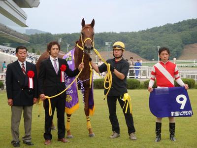 逃げたベストマイヒーロ号(2着)が道中フワフワしていて、余力もありそうだったので差し切れないかもと思いましたが、ゴール前、斬れましたね。母馬(サニーサイドアップ=JRA桜花賞5着馬)が芝でかなり走った馬ですし、血統ですね。初めての長距離輸送でしたが、大人しくて馬体減りもなかった(前走比-1キロ)し、良い状態で臨むことができました。今後については、戻ってからオーナーと相談してから決めたいと思います。