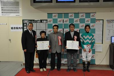 様似町長杯 様似アポイ特別記念イベントの実施 2010.09.29 本日の第9競走「様似町長杯様似アポイ特別競走」を記念して、様似町地場産品等などが当たるプレゼント抽選会がポラリスドームで実施されました。 また、協賛競走の表彰式では、様似町長 坂下 一幸様より優勝馬プレミアムカフェ号の関係者に副賞が贈られました。