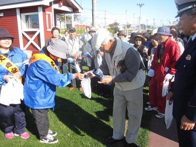 大型バスやマイカーで訪れた競馬ファン一人ひとりに「ストップ・ザ・交通事故死~めざせ安全で安心な北海道~」と書かれた眠気スッキリガムやポケットティッシュなどを手渡し安全運転を呼びかけました。