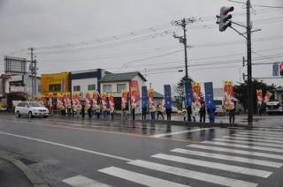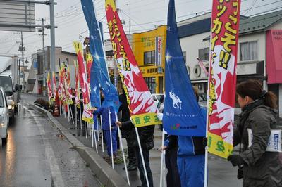 11月8日(月)、地元日高町の国道沿い(235号線と237号線の交差点)で街頭PRを実施。実施主体は、日高町の商工会やトレセン町内会女性部のメンバーで構成された「ホッカイドウ競馬を応援する会(半田会長)」を中心に約40名が集まり、色鮮やかなのぼりを並べて、最終開催のホッカイドウ競馬のPRを行いました。