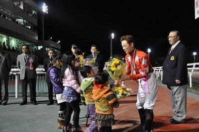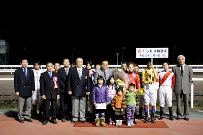 五十嵐 冬樹騎手 1,500勝達成表彰式 2010.11.12 11月10日(水)、五十嵐冬樹騎手(桑原義光厩舎)が、門別競馬第9レースケイエスアイアイ号に騎乗し、中央・地方通算1,500勝を達成した五十嵐冬樹騎手(桑原義光厩舎)の表彰式が11月11日(木)ウイナーズサークルで行われ、ファンの方々や関係者の皆様の祝福をいただきました。