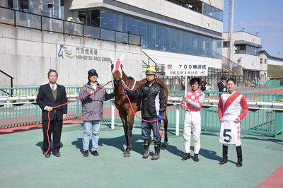 口取り写真では、亀井洋司騎手がプラカードを持ってくれました。なお、700勝達成の表彰式は、5月3日(火・祝)にウイナーズサークルで実施予定です。