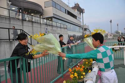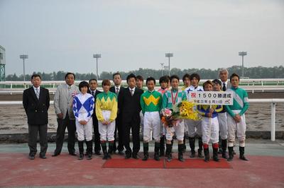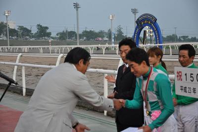 宮崎 光行騎手 1、500勝達成表彰式 2011.06.29 6月23日(木)第7レースコパノワーニング号に騎乗し、地方・中央通算1,500達成した宮崎光行騎手(松本隆宏厩舎)の表彰式が6月29日(水)第8競走終了後、ウイナーズサークルで行われ、ファンの方々や関係者の皆様の祝福をいただきました。