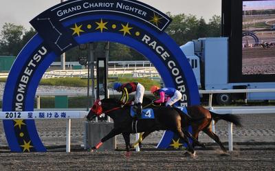 本日の第8競走ウィナーズチャレンジ競走(2歳オープン ダ1700m)が行われ、1番人気ジェネラルグラント号が2着クラグオー号にクビ差つけて優勝しました(1.51.6)。同馬は、これで上級認定競走を優勝し、6月14日(木)に同競走を優勝したミータロー号(田中淳司厩舎)に続いて、7月14日(土)JRA函館2歳ステークス(GⅢ)の出走資格を満たしました。