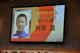 12月26日(水)、2012年度 第45回内閣総理大臣杯日本プロスポーツ大賞(主催:財団法人日本プロスポーツ協会)の授賞式が東京都内のホテルで行われ、ホッカイドウ競馬から新人賞に選出された阿部 龍騎手が出席しました。