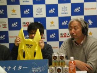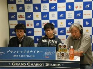 本日のグランシャリオスタジオ(5月3日) 2013.05.03 5月3日(金祝)、第5競走のパドック解説のゲストに放送作家の村上 卓史氏が出演しました。福山競馬の最終競走ファイナルグランプリを制した所有馬ビーボタンダッシュ号(現在は林和弘厩舎所属)の情報や競馬の楽しみ方について、話して頂きました。 また、第10競走に出走したビーボタンダッシュ号のメンコ(覆面)をファンプレゼントとしてご提供して頂きました。後日、ホッカイドウ競馬ホームページでプレゼント予定ですので、どうぞお楽しみに!