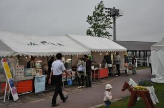 登別地獄まつり賞を記念して、登別市ご提供により、入浴剤「湯の華」が先着200名様にプレゼント。また、とねっこ広場ではひだか特産市が開かれ、新鮮野菜やつぶ串、馬産地グッズなどの販売が行なわれました。