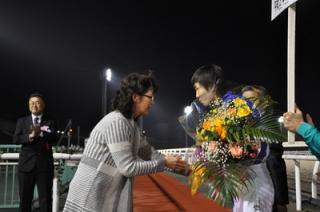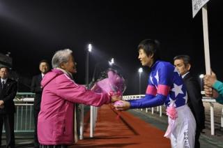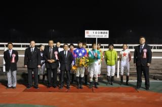10月24日(木)に地方・中央通算100勝を達成した阿部 龍騎手(角川 秀樹厩舎)の表彰式が本日の第8競走終了後、ウイナーズサークルで行われました。