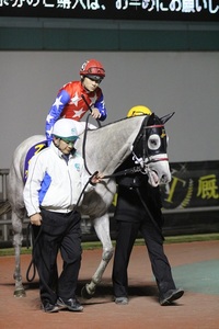 「腰にちょっと緩いところがあり、コーナーでトモが流れるところがあるので、御神本騎手にはその辺りに気をつけて乗ってほしいと伝えました。3コーナーに入る手前から仕掛けてくれて、苦手のコーナーも最内をうまく回って切り抜けることができたので、直線を向くところでは勝てるなと思いました。道営の強いところと比べると相手関係に恵まれたところもあったと思いますが、輸送も4㎏減で切り抜けましたし、レースもほぼ思い通りのレースを御神本騎手がうまくエスコートしてくれました。このあとは、川崎の山崎尋美厩舎へ移籍することになります。応援いただきありがとうございました。」