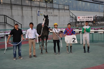 松井伸也騎手400勝達成! 2014.07.30 7月30日(水)、門別競馬 第8レースで松井伸也騎手(齋藤正弘厩舎)がリベリオン号に騎乗し、通算400勝を達成しました(ホッカイドウ競馬では現役13人目 )。 松井伸也騎手コメント 「あまり意識はしていませんでしたが、嬉しいです。400勝はまだまだ通過点ですので、これからもひとつひとつ大事に騎乗していきたいです。」